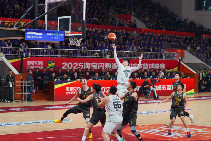“浙BA”赛场上,富阳队对阵台州队。浙江省体育局供图胜利的狂欢,是城市自豪感的巅峰绽放。